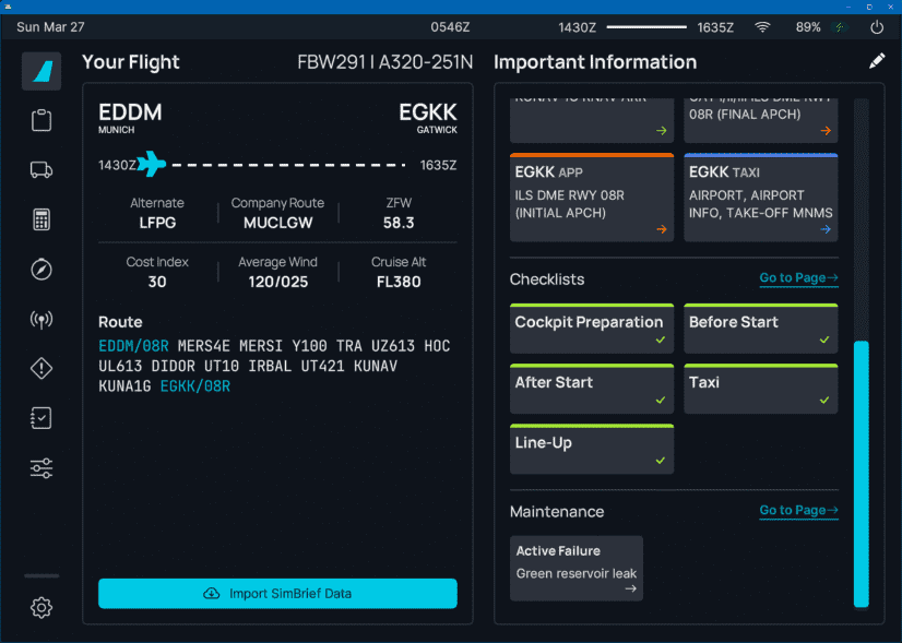 This shows relevant checklists in relation to the current flight phase. Clicking on a checklist card brings up the corresponding checklist.