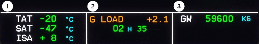 | 3 | Permanent Data Right | Gross Weight (GW) | Gross Weight in green as soon as first engine is started. Last digits dashed if accuracy is degraded. Blue dashes if no data is available. |