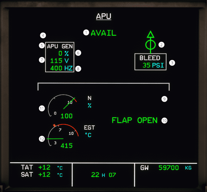 | 12 | APU EGT | Green color | The APU EGT temperature is within normal operating range. |