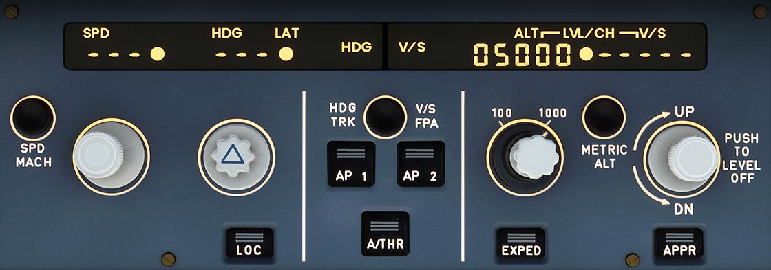 • Manual selection of flight parameters SPD, MACH, ALT, VSPD, HDG or track.
